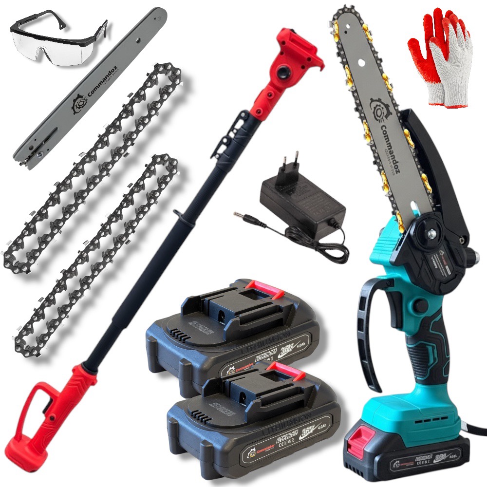 Akumulatorowa piła łańcuchowa 2w1 z wysięgnikiem 2 m – 8”, 2 akumulatory, automatyczne smarowanie