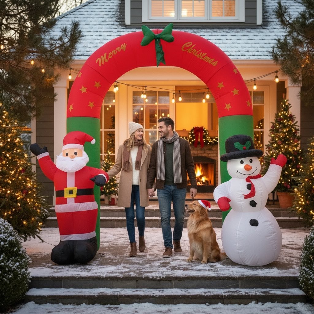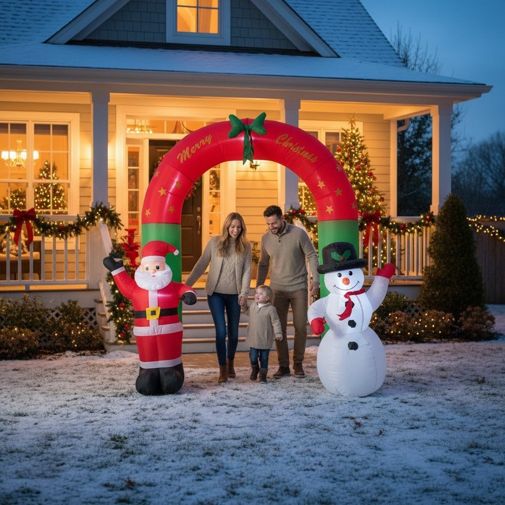 • Bramka 240 cm – duża, imponująca brama z napisem Merry Christmas, Mikołajem i Bałwanem, idealna do ustawienia przy wejściu do domu lub ogrodu.