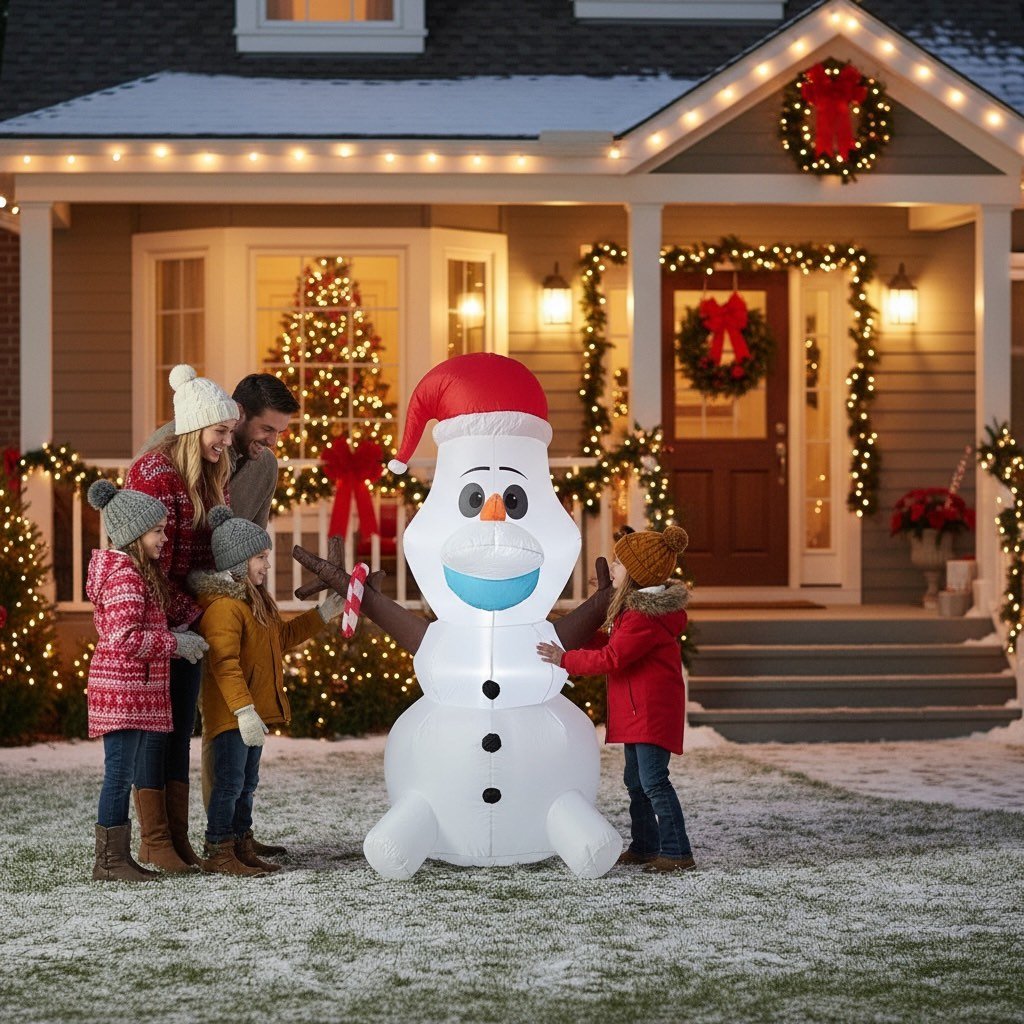 Dmuchany Olaf z czapką Mikołaja to świetna atrakcja dla dzieci. Jego uśmiechnięta buzia i radosny wygląd natychmiast wprowadzą świąteczny nastrój. Dzięki LED-owemu podświetleniu wygląda efektownie także wieczorem.