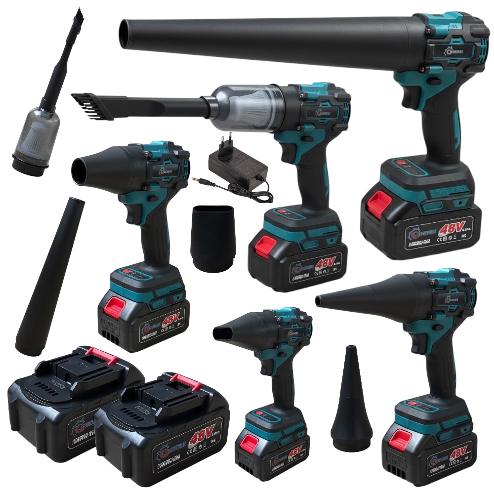 Model 3w1 oferuje kilka końcówek i dysz, które pozwalają dopasować sprzęt do różnych zastosowań. W zestawie znajdują się 2 akumulatory 48VF, ładowarka oraz komplet akcesoriów.