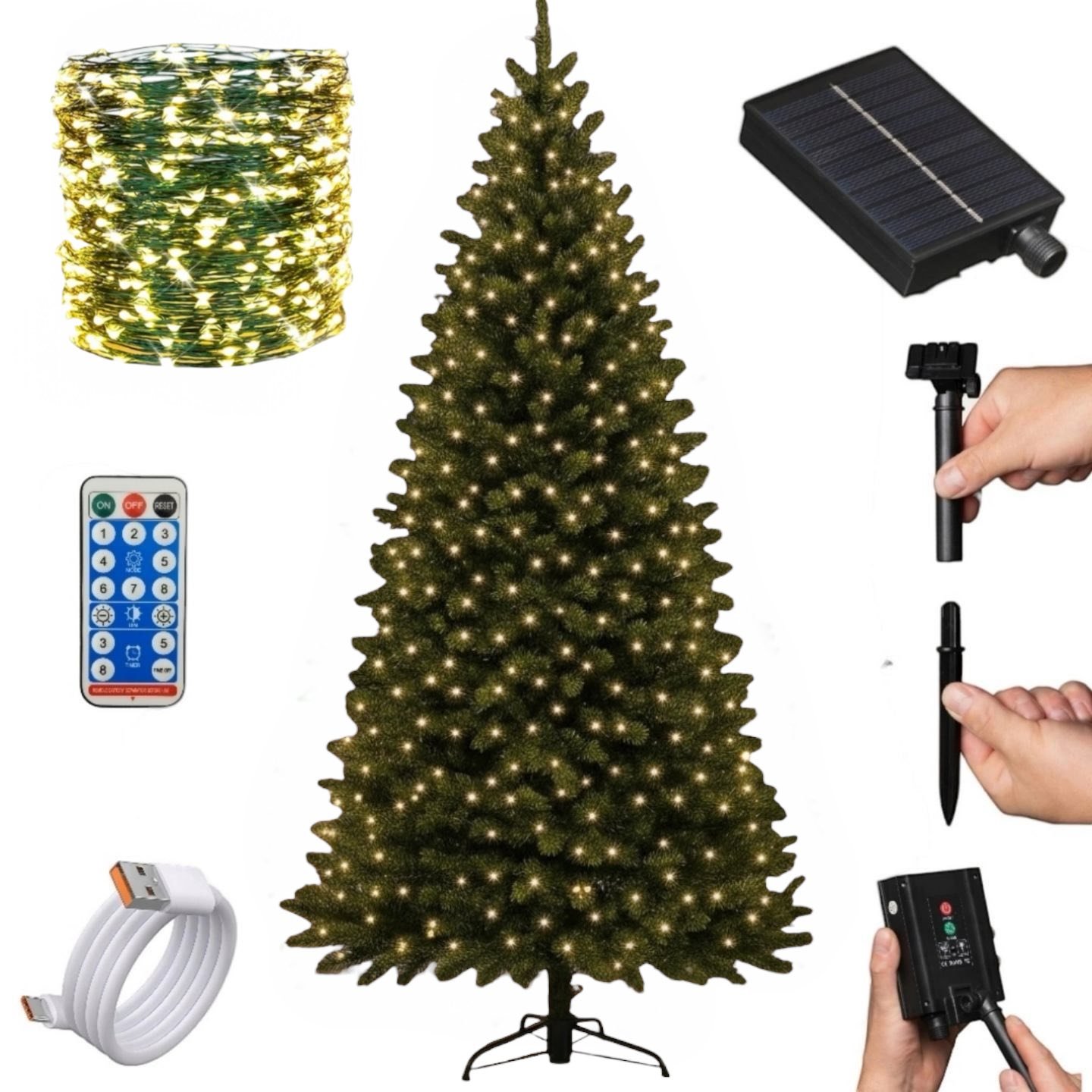 Girlanda LED Solarna 50–100 m w ciepłym białym kolorze. 500–1000 diod, IP44, 8 trybów, ładowanie solarne/220V/USB. Idealna do ogrodu, tarasu i balkonu.