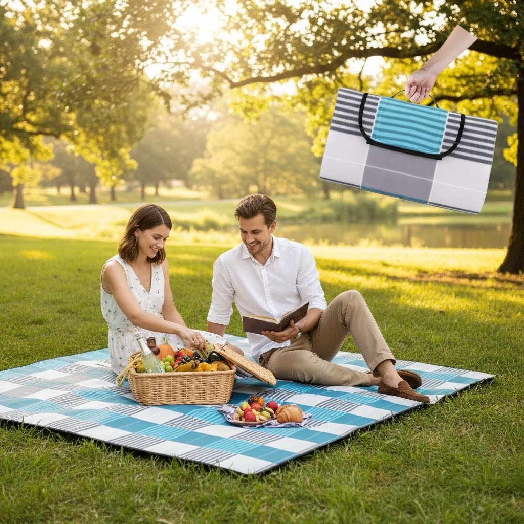 Duży rozmiar pozwala wygodnie usiąść całej rodzinie lub grupie znajomych, a składana konstrukcja z uchwytem sprawia, że koc można łatwo zabrać wszędzie ze sobą.