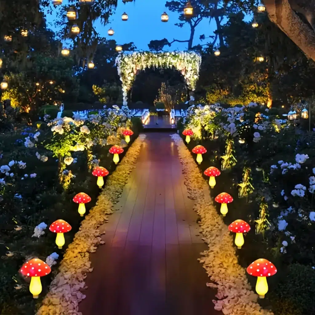 Realistyczny design czerwonych muchomorków sprawia, że lampki stanowią nie tylko oświetlenie, ale także oryginalną dekorację ogrodową.