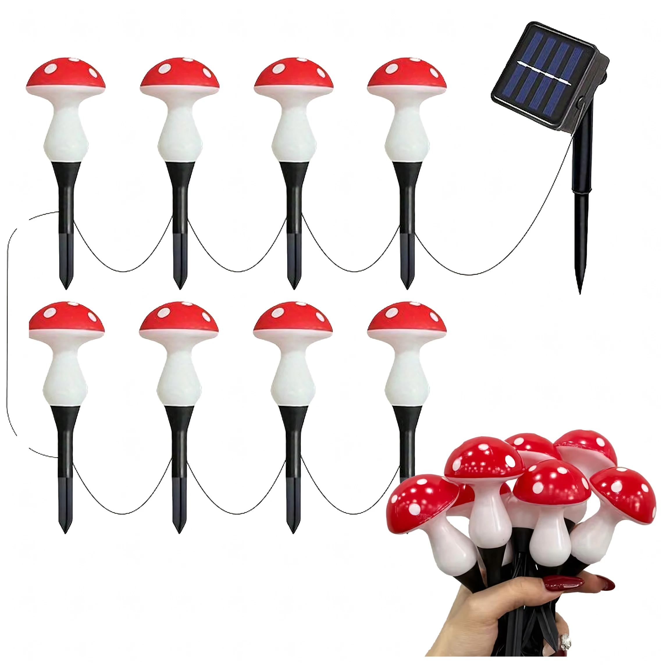 ✔ Dekoracyjny design muchomorków – oryginalna ozdoba ogrodu ✔ Zasilanie solarne – brak kabli i dodatkowych kosztów energii ✔ Automatyczne włączanie i wyłączanie – czujnik zmierzchu ✔ 12 trybów świecenia – dopasuj efekt świetlny do nastroju ✔ Długi czas świecenia – nawet do 8 godzin po pełnym naładowaniu ✔ Wodoodporność IP44 – odporne na deszcz i warunki atmosferyczne ✔ Łatwy montaż – wystarczy wbić lampki w ziemię
