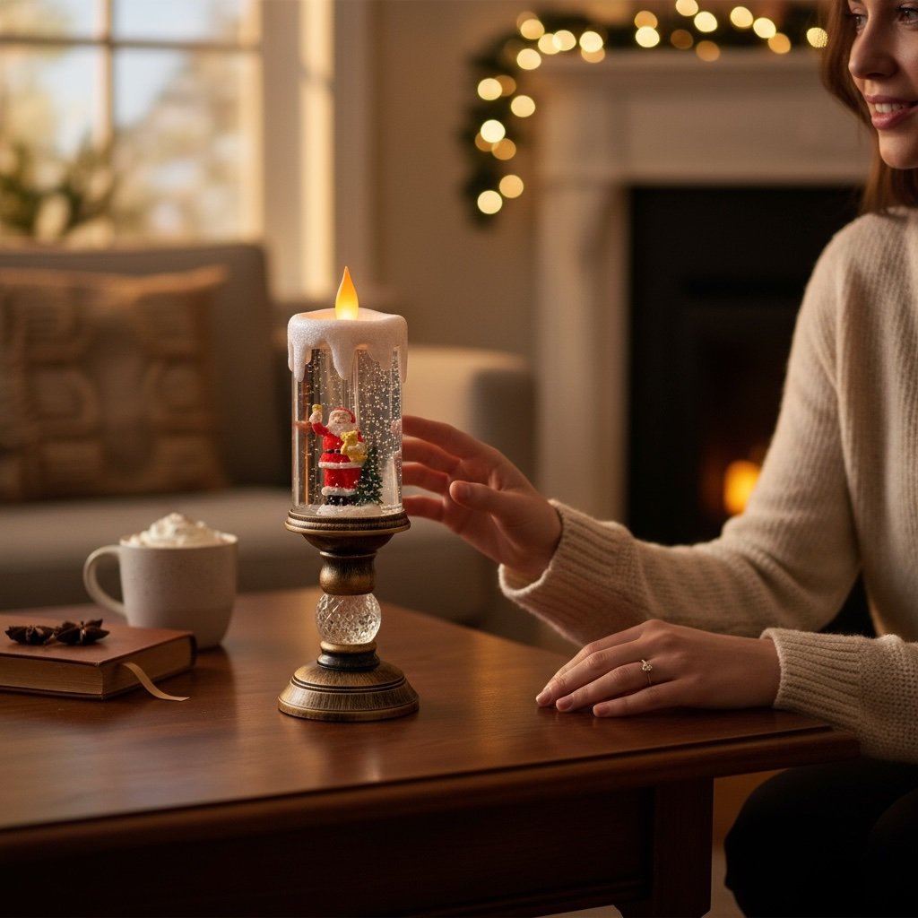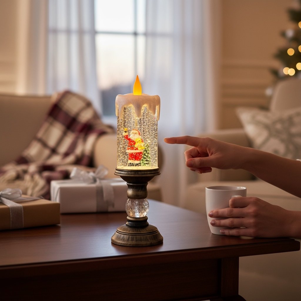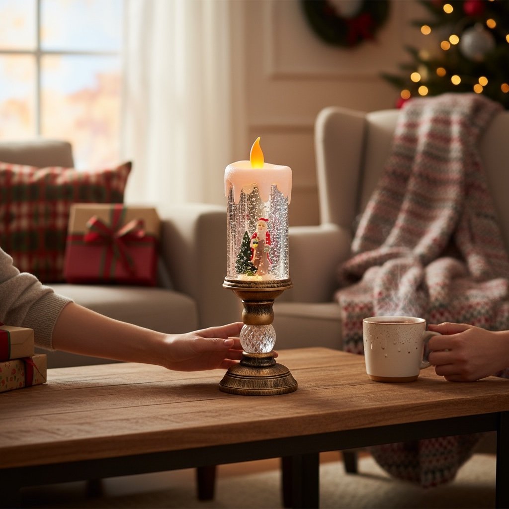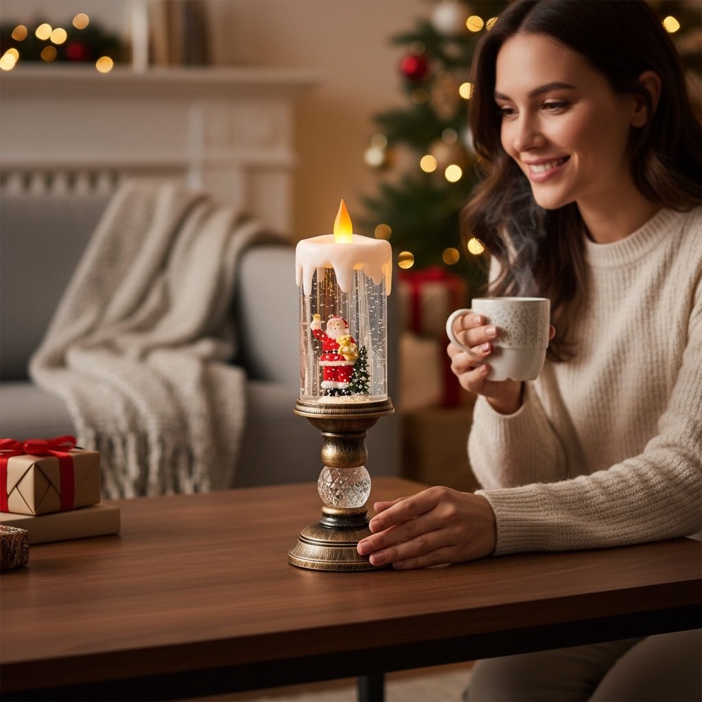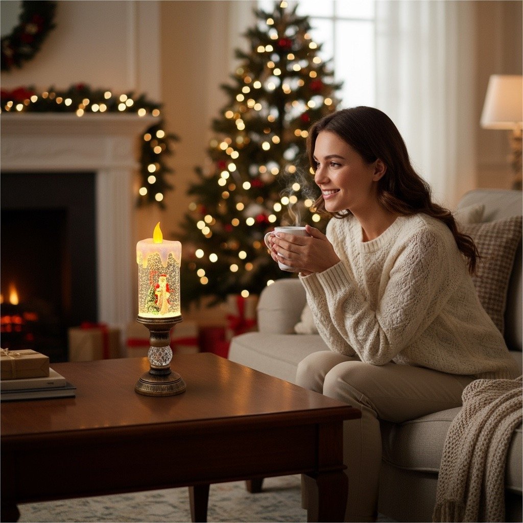Ta niezwykła świeca nie jest zwykłą dekoracją – to małe dzieło sztuki! W jej wnętrzu znajdziesz figurkę Świętego Mikołaja z workiem pełnym prezentów lub uroczego bałwanka, który przypomina o zimowych zabawach na śniegu. Delikatnie wirujący brokat, podświetlany przez ciepłe światło LED, wygląda jak prawdziwy śnieg opadający w zimową noc. Wystarczy ją włączyć, aby poczuć klimat Świąt w każdym kącie Twojego domu.