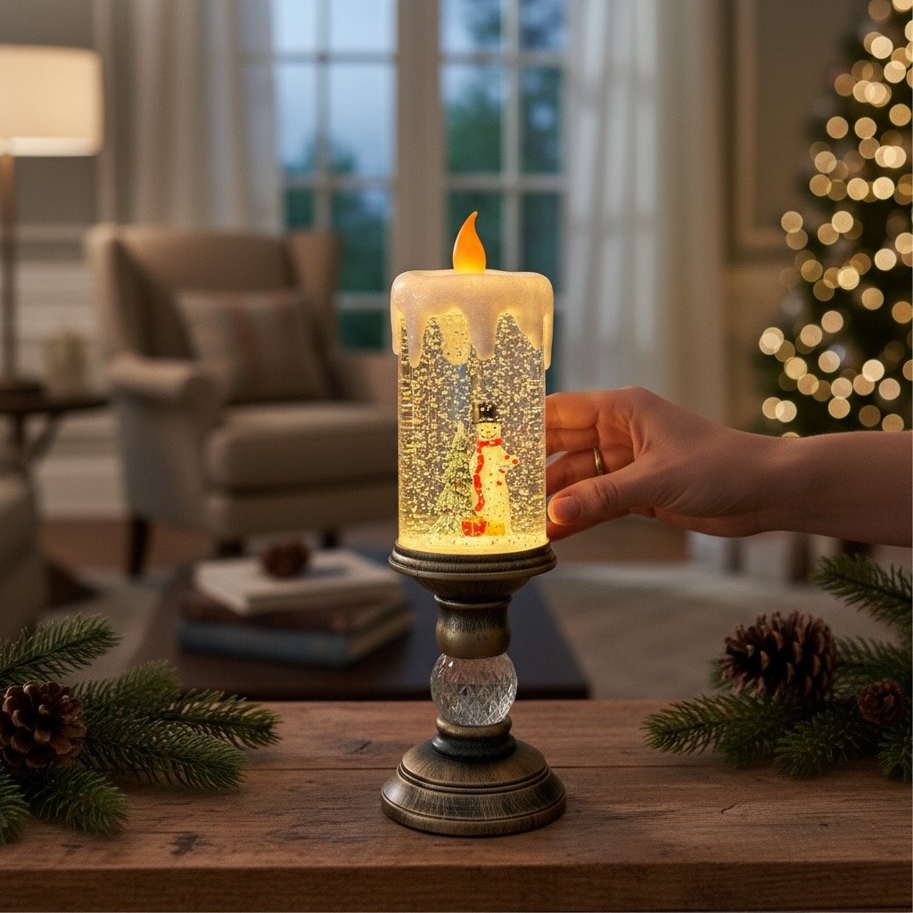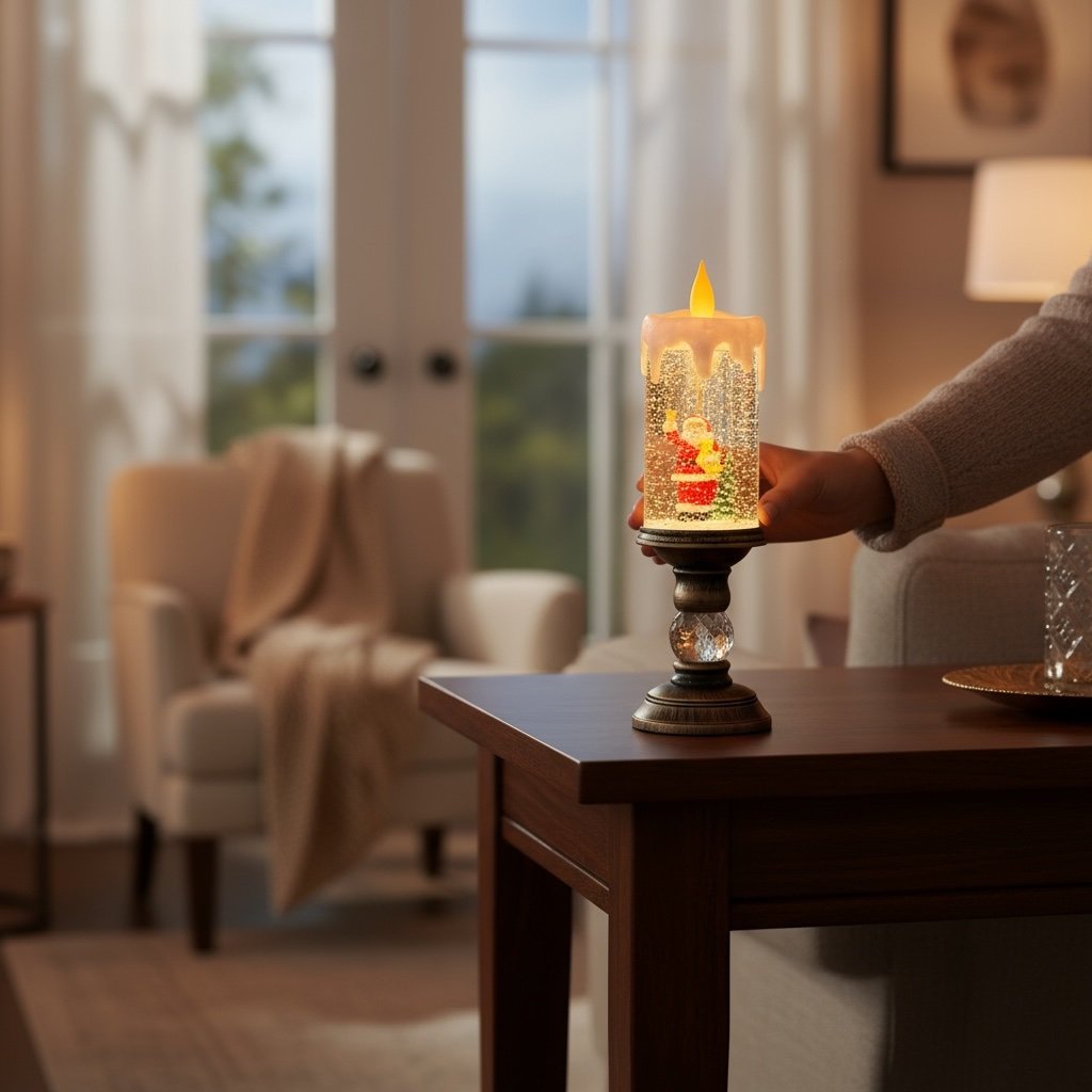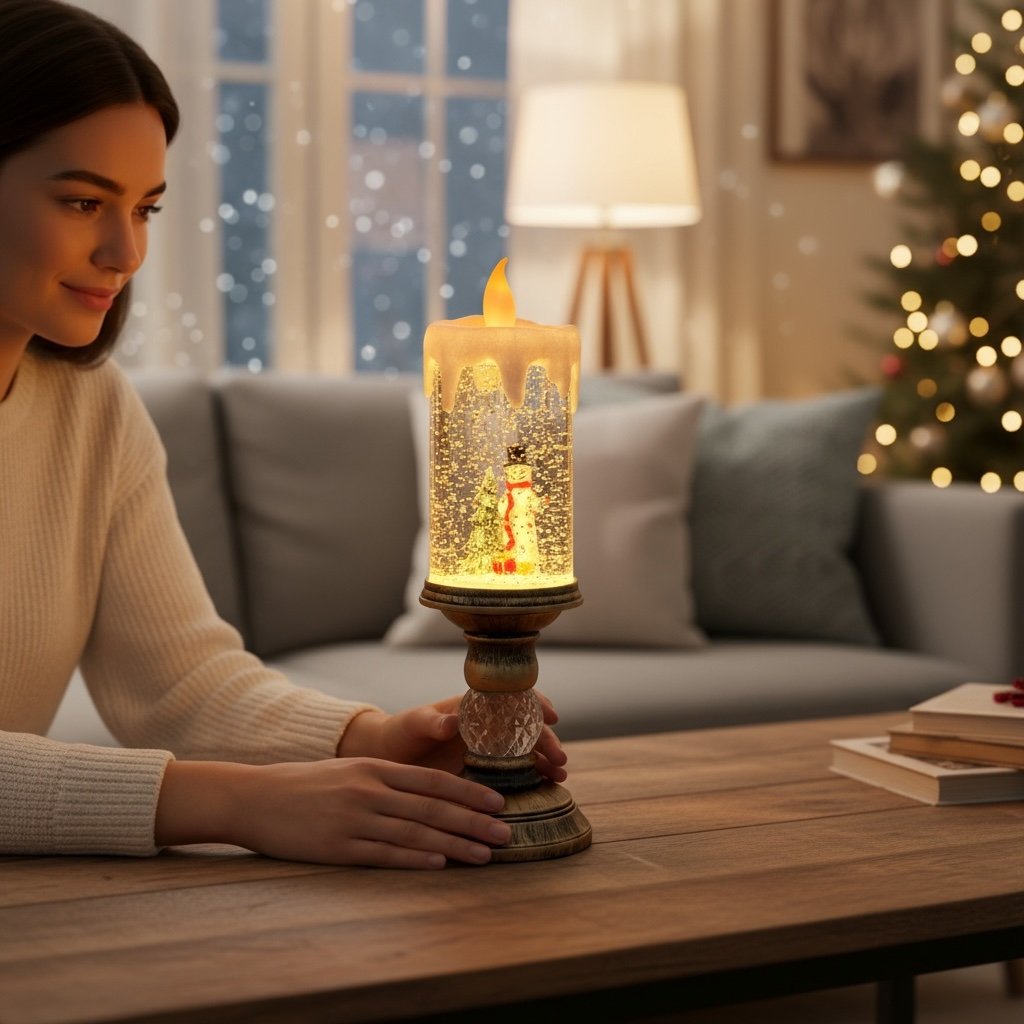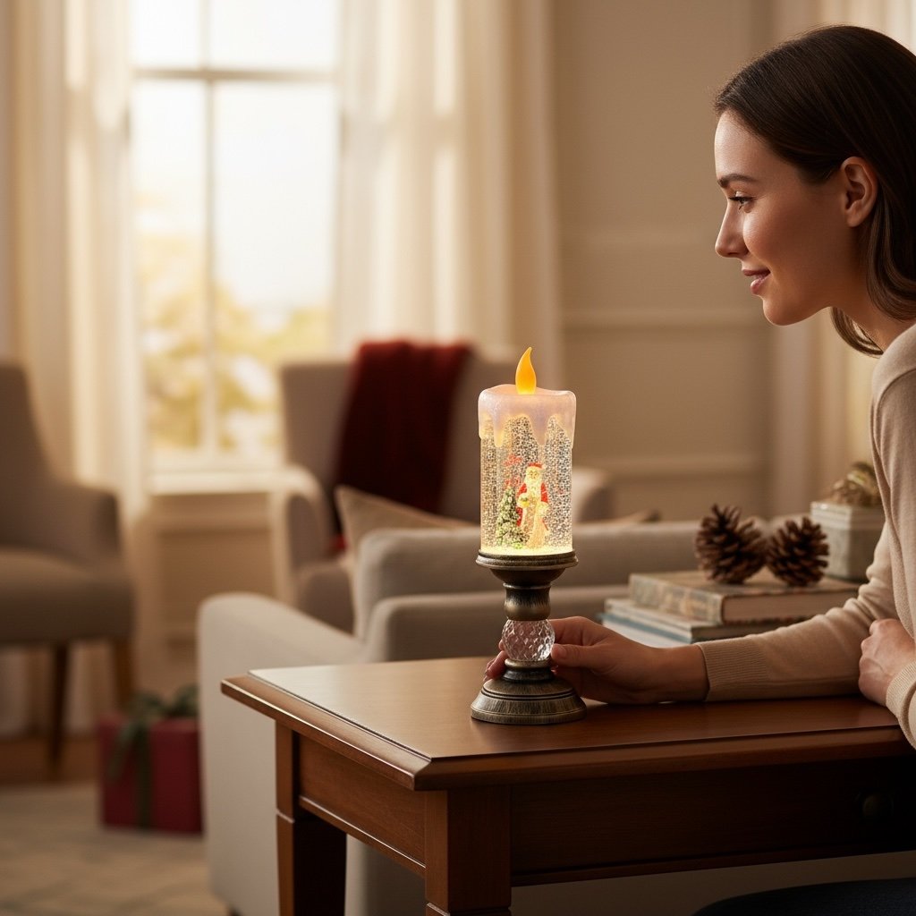 Ta niezwykła świeca nie jest zwykłą dekoracją – to małe dzieło sztuki! W jej wnętrzu znajdziesz figurkę Świętego Mikołaja z workiem pełnym prezentów lub uroczego bałwanka, który przypomina o zimowych zabawach na śniegu. Delikatnie wirujący brokat, podświetlany przez ciepłe światło LED, wygląda jak prawdziwy śnieg opadający w zimową noc. Wystarczy ją włączyć, aby poczuć klimat Świąt w każdym kącie Twojego domu.