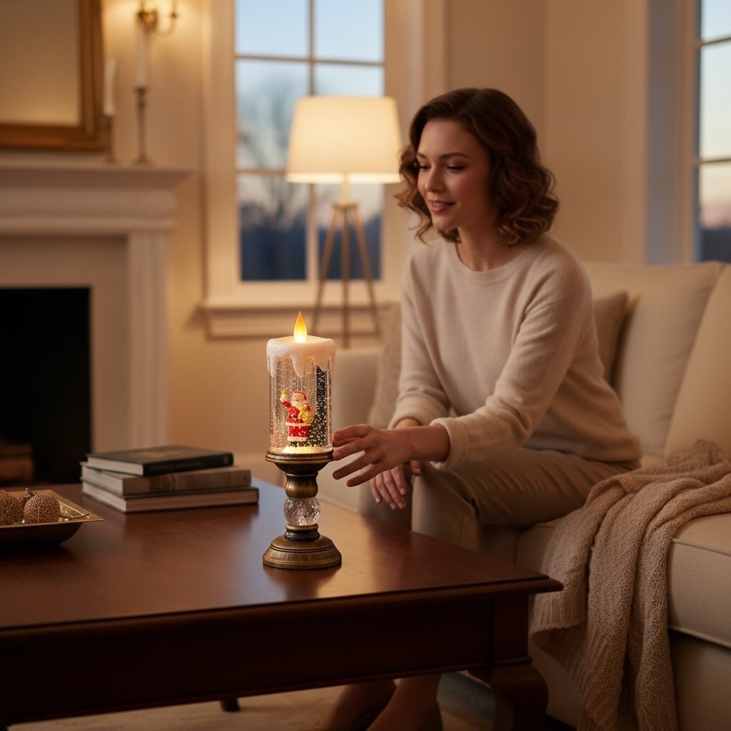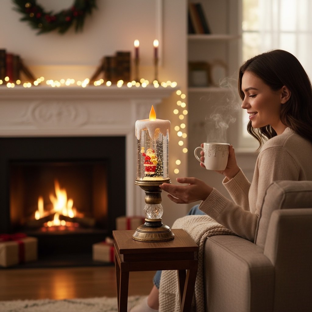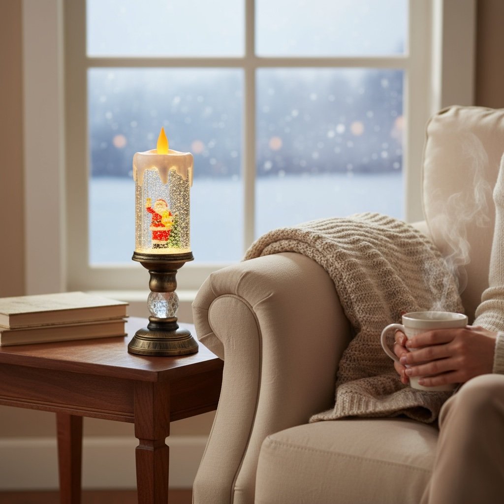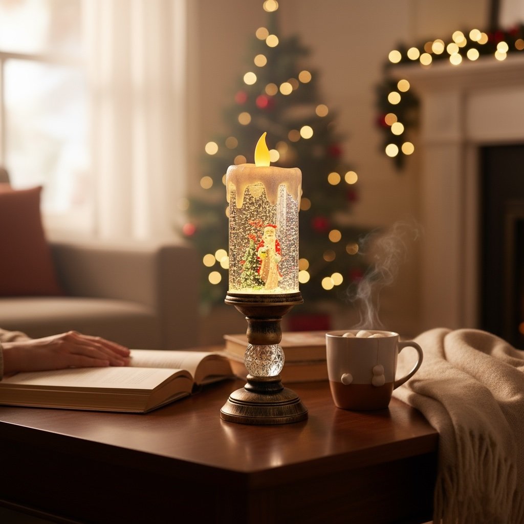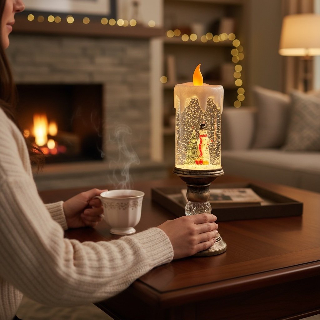 Ta niezwykła świeca nie jest zwykłą dekoracją – to małe dzieło sztuki! W jej wnętrzu znajdziesz figurkę Świętego Mikołaja z workiem pełnym prezentów lub uroczego bałwanka, który przypomina o zimowych zabawach na śniegu. Delikatnie wirujący brokat, podświetlany przez ciepłe światło LED, wygląda jak prawdziwy śnieg opadający w zimową noc. Wystarczy ją włączyć, aby poczuć klimat Świąt w każdym kącie Twojego domu.