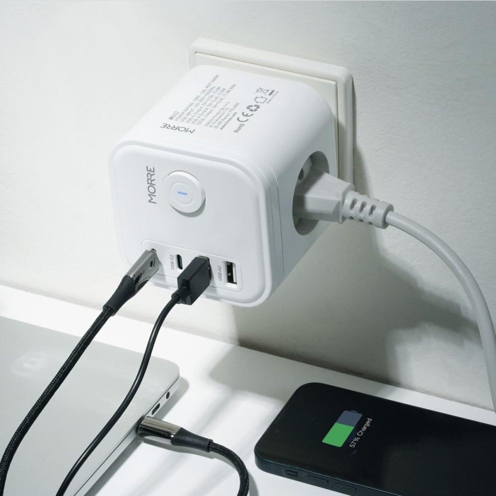 MORRE M402 to praktyczny rozgałęziacz zasilania 7w1, który zastąpi tradycyjną listwę i dodatkowe ładowarki. Dzięki trzem gniazdom AC oraz czterem portom USB możesz jednocześnie ładować i zasilać wiele urządzeń. Kostka wpina się bezpośrednio do kontaktu, zajmuje mało miejsca i sprawdzi się zarówno w domu, jak i w biurze.