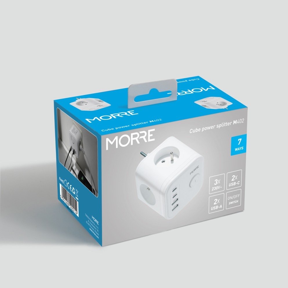 Rozgałęziacz zasilania MORRE M402 to nowoczesna i praktyczna kostka 7w1, która łączy w sobie funkcjonalność tradycyjnej listwy zasilającej i ładowarki USB. Wystarczy wpiąć ją bezpośrednio do gniazdka, aby zyskać dostęp do aż 7 portów zasilania.