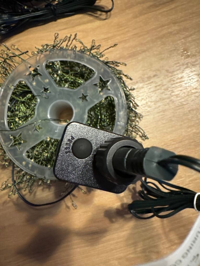 2. Światełka bardzo ciekawie i ładnie wyglądają na choince, nie widać grubych kabli. Kabelek to de facto giętki, ciemnozielony drucik, układa się go bezproblemowo. Większe problemy występują z jego rozwijaniem – poszczególne elementy dekoracji się plączą, drucik nawinięty jest na maleńki plastikowy, nierozbieralny bębenek. No i barwa światła – nie powiedziałabym, że jest ciepła biała. To zdecydowanie raczej 5000 lumenów czyli białe światło neutralne, nie ciepłe.