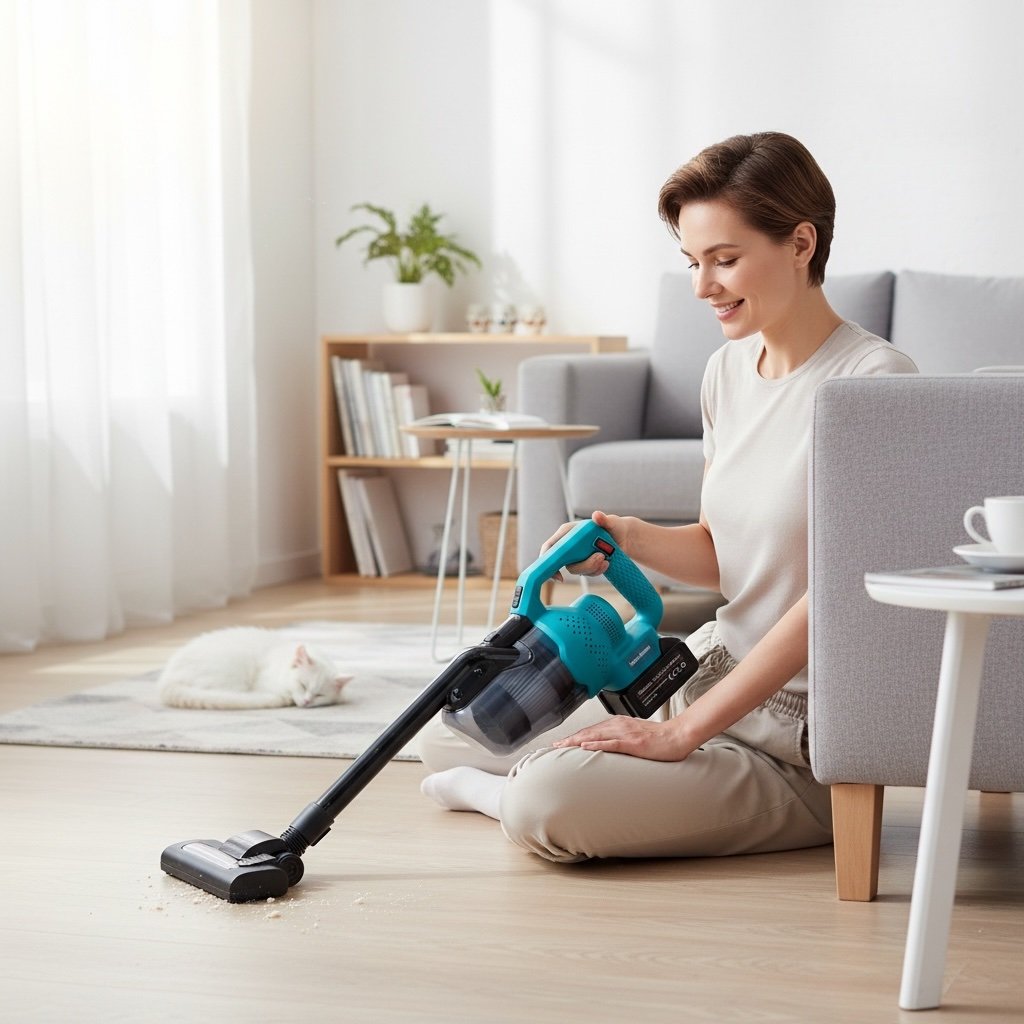 Urządzenie waży jedynie 1,5 kg (bez akumulatora), co sprawia, że jest bardzo wygodne w użytkowaniu. Ergonomiczny uchwyt zapewnia pewny chwyt, a bezprzewodowa budowa ułatwia sprzątanie nawet w trudno dostępnych miejscach.