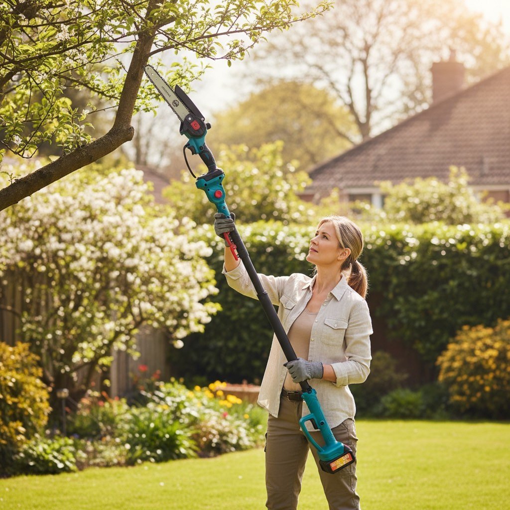 Wysięgnik teleskopowy eliminuje konieczność używania drabiny, co zwiększa bezpieczeństwo podczas przycinania gałęzi na wysokości.