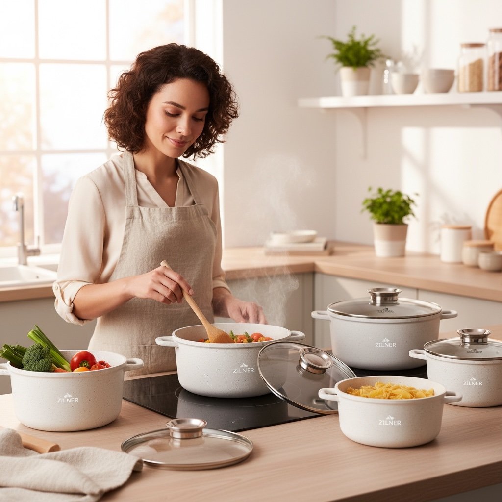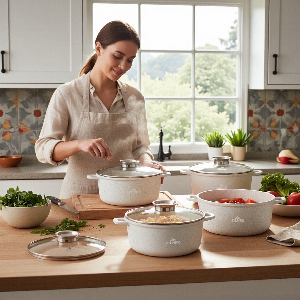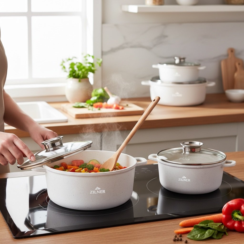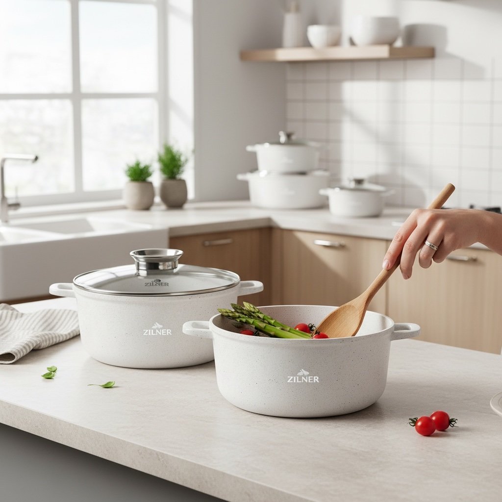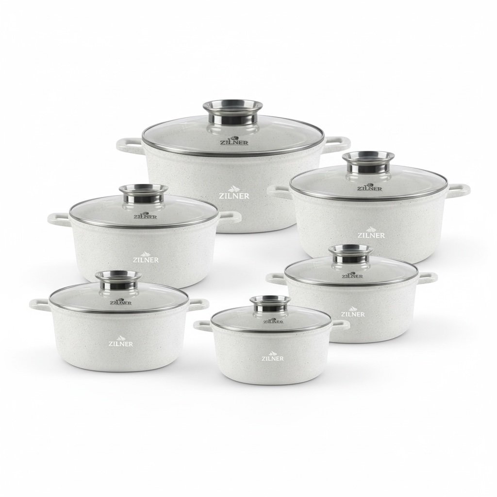 Zestaw garnków ZILNER ZL-8573 to nowoczesny komplet do codziennego gotowania w domu. Garnki wykonane z aluminium z trwałą powłoką ceramiczno-marmurową zapewniają równomierne rozprowadzanie ciepła, odporność na zarysowania oraz wygodne użytkowanie. Nieprzywierająca powierzchnia pozwala gotować z mniejszą ilością tłuszczu, a gładkie wnętrze ułatwia czyszczenie.Komplet sprawdzi się na wszystkich typach kuchenek: indukcyjnych, gazowych, elektrycznych i ceramicznych. Szklane pokrywki z odpowietrznikiem pary umożliwiają kontrolę gotowania bez podnoszenia pokrywki. Zestaw obejmuje kilka pojemności garnków, dzięki czemu można przygotować zarówno małe porcje, jak i większe dania dla całej rodziny.Uniwersalny design w kolorze białym z efektem marmuru pasuje do nowoczesnych i klasycznych kuchni. To praktyczny zestaw do gotowania zup, sosów, makaronów, mięs, warzyw oraz dań jednogarnkowych.