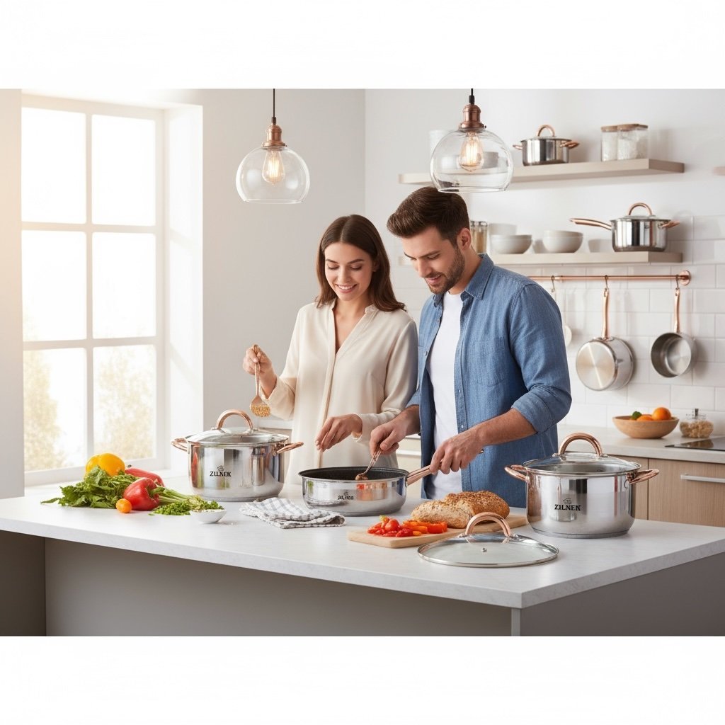 ZILNER zestaw garnków 12 elementów to kompletny, elegancki i trwały zestaw garnków ze stali nierdzewnej do codziennego gotowania. Komplet jest przystosowany do kuchenek indukcyjnych i gazowych, a także płyt elektrycznych i ceramicznych, dlatego świetnie sprawdzi się w każdym domu – od nowoczesnej kuchni po mieszkanie wynajmowane. Wybierając komplet garnków 12 el., otrzymujesz pełen zakres pojemności do przygotowywania zup, sosów, makaronów, dań jednogarnkowych i potraw duszonych.