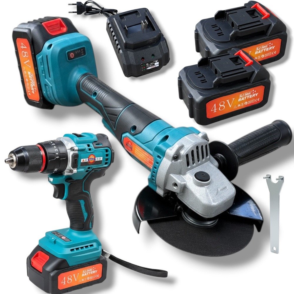 Zestaw Szlifierka Kątowa 125 mm + Wiertarko-Wkrętarka Akumulatorowa 48VF Bezszczotkowa + 2 Akumulatory + Walizka + Wiertła i Bity
